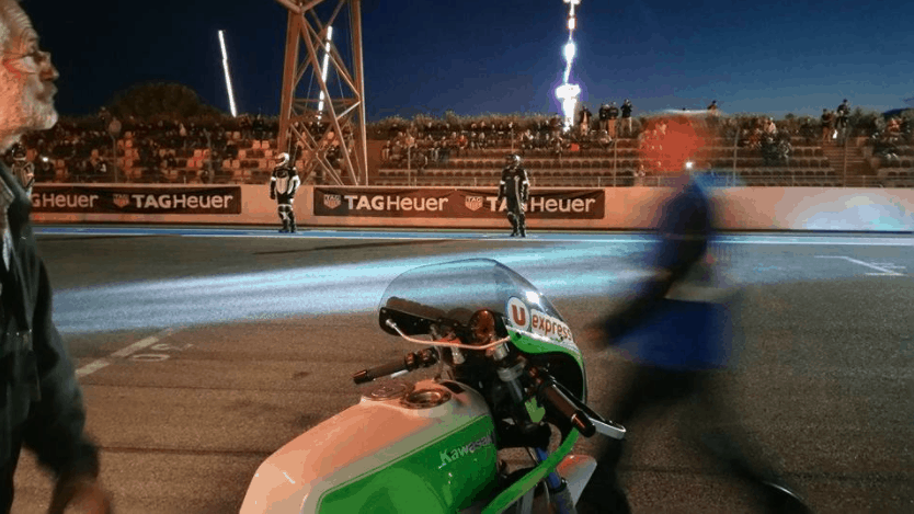 Petit retour sur la moto choisie : si le cadre et les carters moteur sont restés d’origine, leur ingénieur allemand Hans l’a affûtée subtilement pour allier performances et fiabilité. Même si le Bol d’Or Classic se court sur deux manches de 2 heures, une moto de 35 ans d’âge mérite respect et soin. Le bras oscillant provient d’une Kawasaki ZRX 1100 et la fourche d’une autre Kawa, une 1000 RX. La préférence de Hans pour les pièces Kawasaki s’explique par ses nombreuses années de concessionnaire rennais et son engagement féru en championnat du monde d’endurance dans les années 90 avec des ZXR 750 et autres ZX7-R.