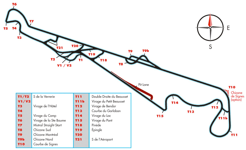 Reprenons la piste par son début : la ligne droite des stands, en légère descente. Elle mène au premier enchaînement de virage, le « S » de la Verrerie. Depuis les travaux de 2000, il est beaucoup moins rapide qu’avant. Et aujourd’hui pas mal bosselé, ce qui modifie la trajectoire. On freine très fort au bout de la ligne droite des stands pour y entrer avec une vitesse de passage pas très rapide afin d’aborder le second droite au mieux pour attaquer la petite ligne droite qui suit. Elle mène au virage de l’Hôtel, un autre enchaînement, dont le premier droit s’aborde avec pas mal de vitesse, sur l’élan, qui permet de se laisser « mourir » dans le gauche suivant, en conservant bien la corde. Il ne faut trop se laisser emmener sur la droite de la piste pour aborder après l’un des virages les plus lents du Ricard, le virage du Camp, une épingle à droite sans intérêt mais où il est facile de doubler sur les freins.